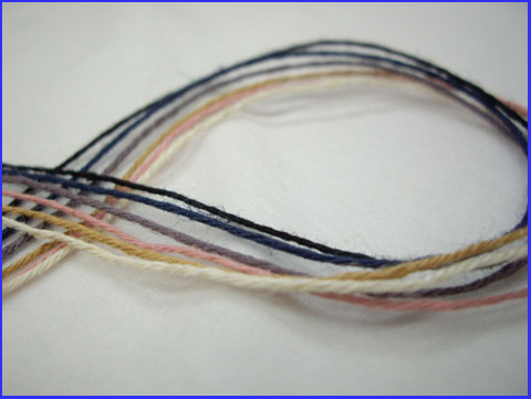 ・カバードヤーン(カバーリングヤーン)は、芯に対して一方向に被覆されているものをSCY、芯に対して一方向被覆した後、もう一方向に被覆したDCYとがありますが、組紐の場合は、糸が交差していく形で出来ています。